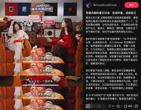 在汇聚了百万人在看的#袁娅维和陈婧霏真的聊透了 的小红书热点里,有不少乐迷将她们对话中关于创作、自我和灵魂共振的内容做成了语录截图,并在笔记中分享着自己的故事和感悟。地球村音乐会2026系列演出所创建的交流和连接在大家的反馈中,形成了闭环。