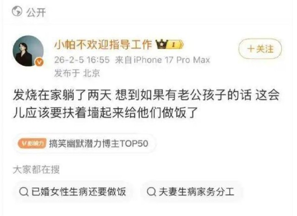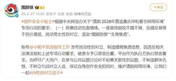 近日,脱口秀演员小帕因在微博发布挑动性别对立、煽动婚育焦虑的内容,遭到平台禁言。此次事件不仅是中央网信办开展清朗·2026年营造喜庆祥和春节网络环境专项行动的一部分,也标志着对于网络言论,特别是公众人物的创作边界,已经划下了明确的红线。作为身处网络舆论场的一名大学生,关注这一事件的同时,我深感网络表达中的理性与包容是至关重要的。言论可以自由表达,但必须有边界。任何通过情绪化宣泄博取流量、将个人感受上升为群体对立的行为,终究会受到规则的制约,并遭到社会的唾弃。 从此次小帕发布的违规内容来看,其提到发烧卧床若有家庭便要扶墙做饭的言论,之所以被认定为挑动对立,核心问题并非她表达了个人对于婚姻生活的感受,而是将这种个人的体验极端化、标签化,过度渲染婚姻对女性的束缚,并扩大婚育焦虑,把两性关系塑造成了一个非此即彼的对立局面。实际上,婚育的选择是每个人的自由。有人向往柴米油盐的家庭生活,也有人偏爱单身的自由,这本是多元社会中正常的景象。但当这种个人选择被包装成群体共识,并将婚姻和生育妖魔化时,便已越过了正常表达的边界,变成了制造群体隔阂的工具。