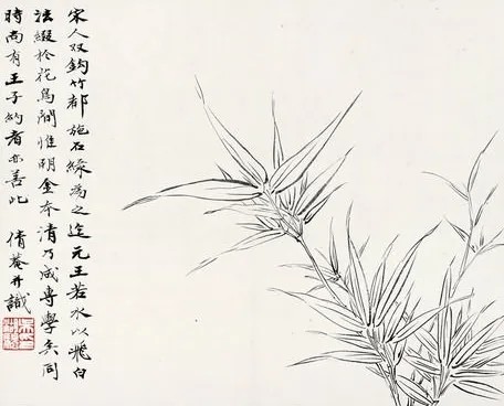 (六)宋人双钩竹,都施石绿为之。迄元王若水以飞白法缀于花鸟间,惟明金本清乃成专学矣。同时尚有王子约者亦善此。倩菴并识。