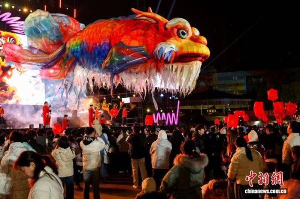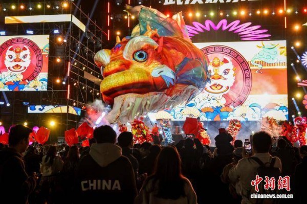 3月2日,武汉欢乐谷张灯结彩迎元宵。市民与游客在园区里赏花灯、品民俗、尝美食,观看“飞天鳌鱼”、打铁花、花车巡游等活动,迎接元宵佳节的到来。图为“飞天鳌鱼”表演吸引游客观看。中新社记者 张畅 摄