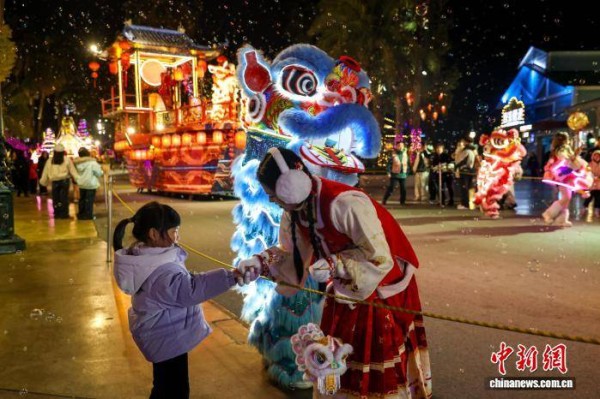 3月2日,武汉欢乐谷张灯结彩迎元宵。市民与游客在园区里赏花灯、品民俗、尝美食,观看“飞天鳌鱼”、打铁花、花车巡游等活动,迎接元宵佳节的到来。图为花车巡游的工作人员与小朋友互动。中新社记者 张畅 摄