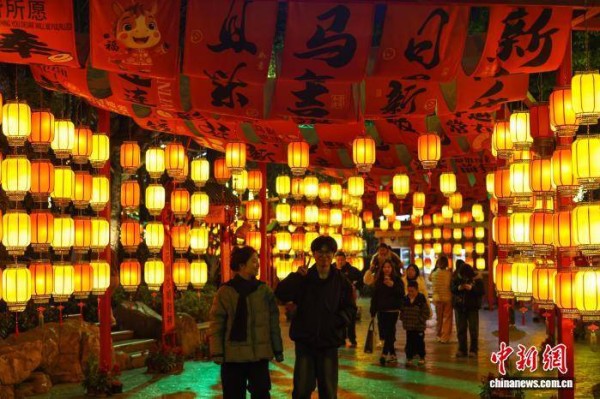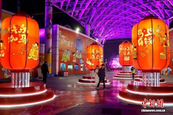 3月2日,武汉欢乐谷张灯结彩迎元宵。市民与游客在园区里赏花灯、品民俗、尝美食,观看“飞天鳌鱼”、打铁花、花车巡游等活动,迎接元宵佳节的到来。图为游客赏花灯。中新社记者 张畅 摄
