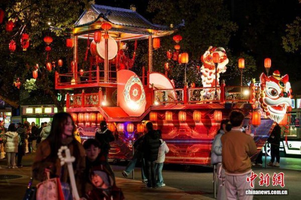 3月2日,武汉欢乐谷张灯结彩迎元宵。市民与游客在园区里赏花灯、品民俗、尝美食,观看“飞天鳌鱼”、打铁花、花车巡游等活动,迎接元宵佳节的到来。图为游客观赏花车巡游。中新社记者 张畅 摄