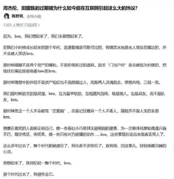 其实,这场风潮能席卷不同年龄层,核心从来不是“证据是否严谨”,而是它唤醒了一代人的青春记忆。有知乎高赞回答写道:1979—1989年出生的人,成长路上都藏着周杰伦的歌词和田馥甄的歌声,那时候的感情很纯粹,“有情饮水饱”是常态,婚姻是情感的延伸,而不是利益的合作,歌手写歌可以藏暗号,同台可以不设剧本,不用考虑公关、不用绑定品牌,那种“我写这句词只给你听”的浪漫,是现在的娱乐工业很难再有的。