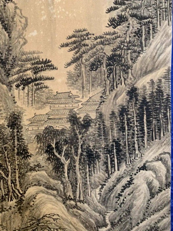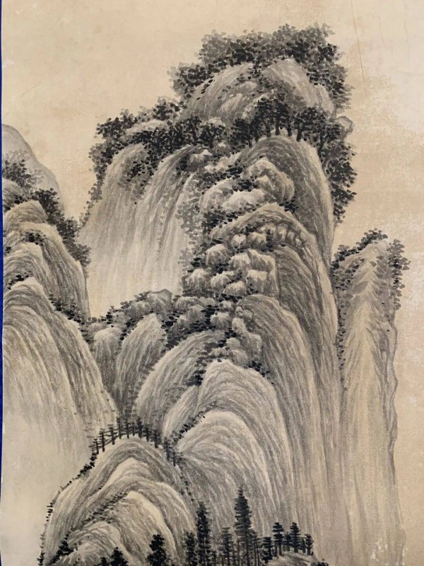 张大千这轴“仿大痴道人法”的山水画,乍一看是老实临古,细品全是“小心机”!大痴道人就是元代黄公望,他画山水爱用“披麻皴”,线条像麻绳一样细密,专治各种山石纹理。张大千这画里,山体轮廓用浓墨勾得硬气,皴法却学黄公望的“披麻”,但没照搬——他掺了董源的“雨点皴”,密密麻麻的短笔,像山体被雨水砸出的坑,远看是黄公望的温润,近看又多了份厚重,活脱脱“古法新穿”!