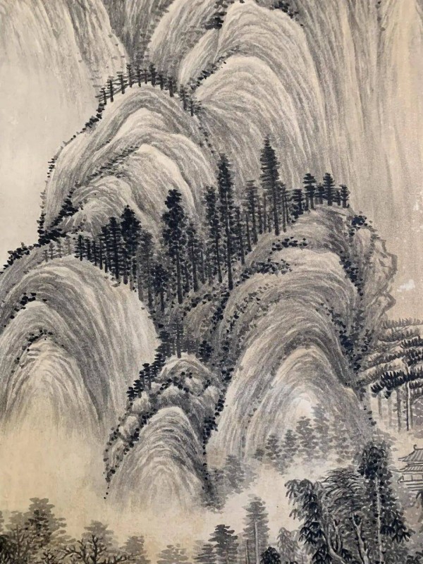 最妙的是题款——“仿大痴道人法”,张大千没藏着掖着,但落款位置偏右上角,像故意留白,让观者视线先被山吸引,再顺着题款往上走,最后停在空白处,仿佛在说:“古法是根,但我的画,得你自己品!”这哪是“仿”?分明是借古人的壳,装自己的新酒,喝着是黄公望的味,回味却是张大千的劲儿!