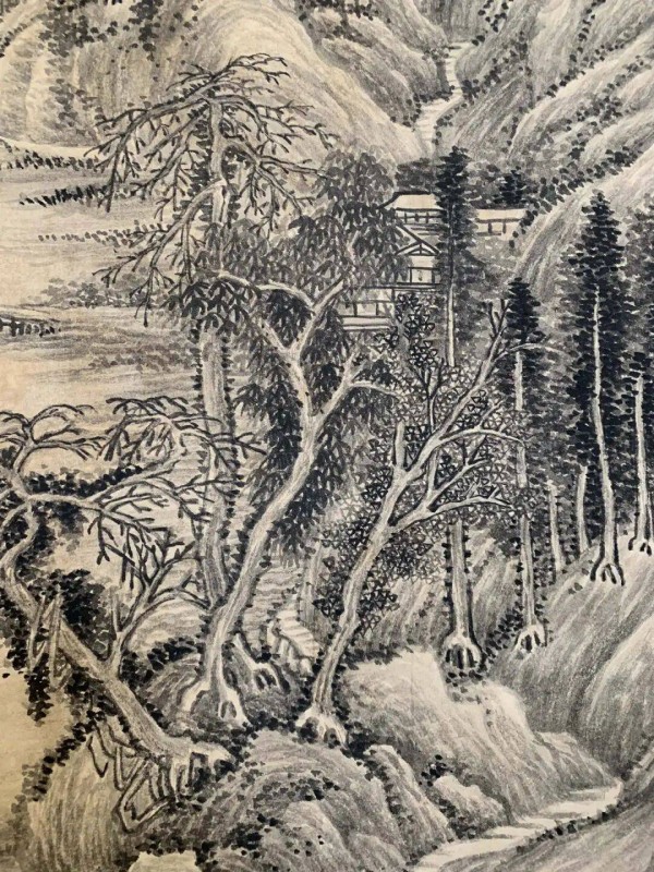 构图更绝!黄公望画《富春山居图》,山是平缓的“波浪线”,张大千却把主峰画得陡峭,像刀削的悬崖,但用云雾一绕,立马软下来,刚柔并济。山脚下几间茅屋,屋顶用浓墨压着,房檐却用淡墨勾,虚实一对比,房子像要飘起来,比黄公望的“实打实”多了份仙气。