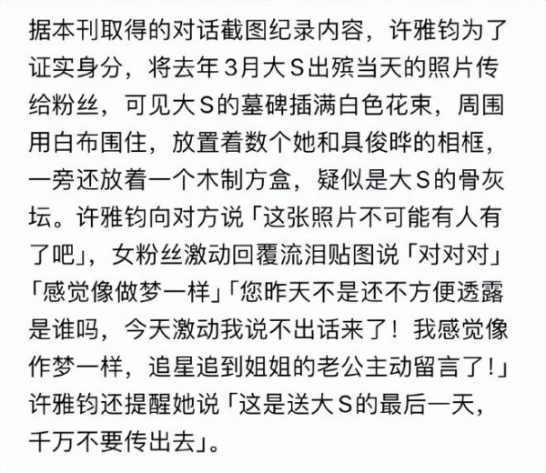 据爆料,事件发生在2025年大S离世后。许雅钧通过微信主动联系了一位在北京学习法律的台北籍女粉丝,该粉丝自称是大S的拥趸。为了取信对方、证明自己“本尊”身份,许雅钧直接抛出了一枚“重磅炸弹”——一张大S出殡当天的现场照片。照片内容极为私密,包含了墓碑、白布围挡、遗像相框以及疑似骨灰盒的木制方盒。发送之际,他还特意附言强调“这张照片不可能有人有了吧”,并紧接着叮嘱对方:“这是送大S的最后一天,千万不要传出去给任何人。”