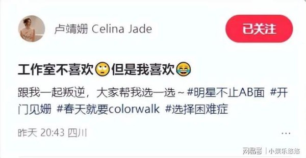 卢靖姗生下儿子后感觉颜值都回春了不少,在3月11日,卢靖姗还晒出了自己在公园拍的美照,还配文:工作室不喜欢但是我喜欢。