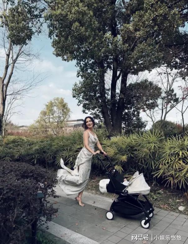 41岁卢靖姗春天遛娃!穿银色礼裙配高跟鞋推婴儿车,二胎儿子好乖