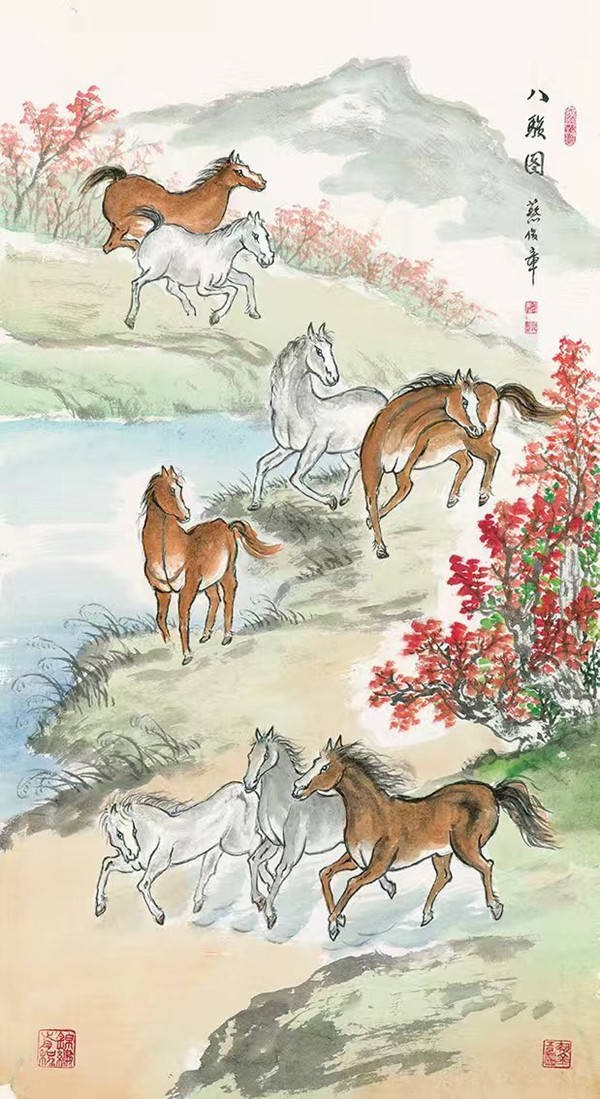 《八骏图》则更具文人画的诗意。群马或跃于山岗,或踏过浅滩,或立于坡岸,在红叶与青山的映衬下,少了几分凌厉,多了几分悠然。画家以赭石、花青等设色晕染山水,将马群融入自然景致之中,体现了 “天人合一” 的传统美学。红马的热烈、白马的清雅、棕马的沉稳,在色彩对比中丰富了画面层次,而马的动态则在山水的静穆中更显灵动 —— 这是一种 “于动中见静” 的智慧,既保留了奔马的进取精神,又融入了对自然的敬畏与从容。