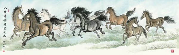 在《八骏奔腾万里驰骋》中,画家以劲健的线条勾勒骏马的骨骼与肌肉,墨色浓淡交错间,将马的力量感与速度感推向极致。八匹马姿态各异:或昂首嘶鸣,或奋力前冲,鬃毛与马尾在风中飞扬,蹄下生风,仿佛能听见踏破山河的轰鸣。画家借鉴了徐悲鸿画马的写实技法,又融入了张大千画派的写意精神:以焦墨刻画马的轮廓,以淡墨晕染背景的草色与云天,在虚实之间营造出 “万里驰骋” 的空间纵深感。题款 “八骏奔腾万里驰骋” 以行书书写,笔力遒劲,与奔马的气势相得益彰,将画面的豪情推向高潮。