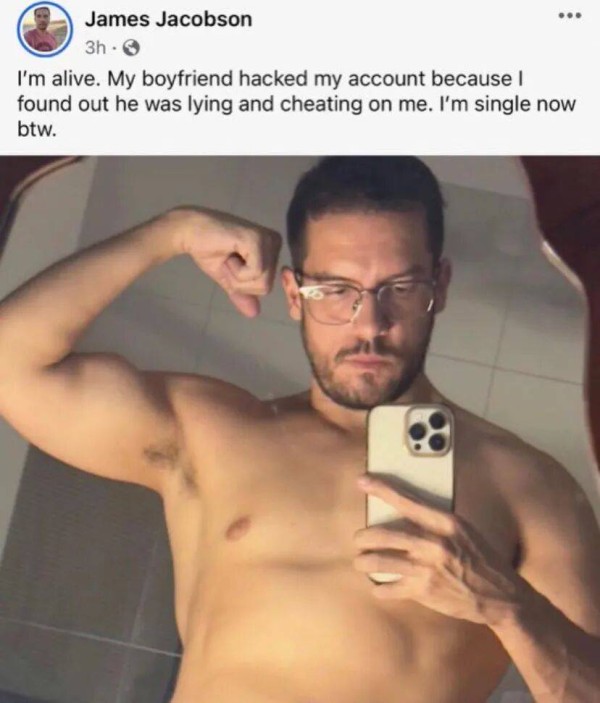 “我还活着。我男朋友因为我发现他在撒谎和出轨而黑了我的账号。现在我单身了,顺便说一句。”