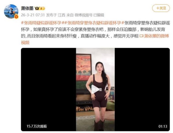 当天,张雨绮亲自上阵,化身塑身衣“代言人”。她不仅将修身款塑身衣紧紧裹在身上,清晰展示出平坦紧致的腰腹线条,更是现场来了个“动作教学”:大幅度扭腰、弯腰展示灵活性,全程身形纤瘦,动作利落,丝毫不见孕肚踪影或孕期常见的疲惫感。这哪像是需要“暂停工作”安胎的状态?分明是“事业女战神”在线营业。
