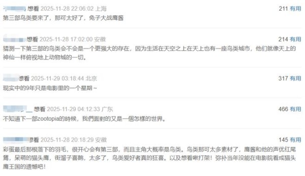 而对于鸟类这个新种群的加入,观众们都有自己的看法,甚至纷纷推荐各种不同的鸟类角色,而且也都很好奇,地上跑的、水里游的,将会与天上飞的产生怎样的摩擦。因而,观众们也都表示《疯狂动物城3》必看。