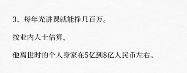 据业内人士透露,张雪峰生前可没少赚钱,每年光是讲课就能赚几百万,按业内人士估算,张雪峰在离世时,他的个人身价就可能达到5亿到8亿人民币左右。