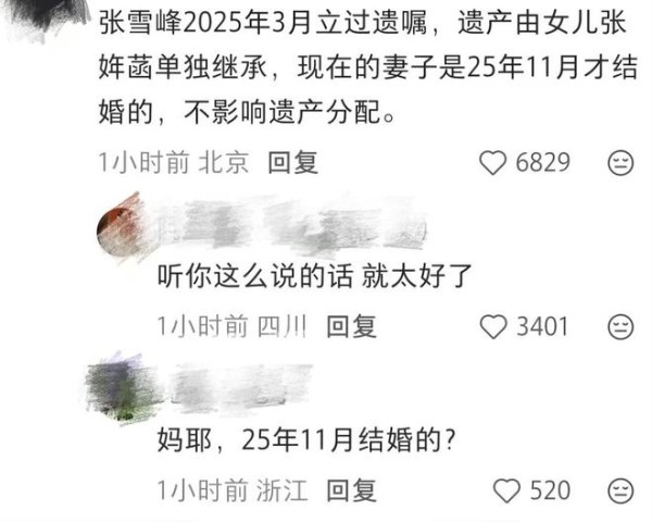 25日晚间,有网友在评论区留言,称张雪峰早在2025年3月的时候就已经立过遗嘱了,遗产由女儿张姩菡单独继承,现在的妻子是在25年11月才结婚的,因此不影响遗产分配。