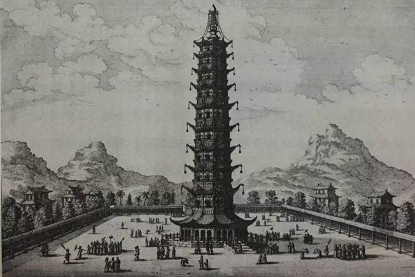 这个中餐外卖盒上的塔的确是南京的大报恩寺塔,而且这个塔的原图也能被找到,来自于《尼霍夫游记》中大报恩寺塔的雕版画。大报恩寺在西方世界会成为中国传统建筑的象征,很大程度上是因为荷兰画家约翰·尼霍夫写的这本《尼霍夫游记》,这本书出版于1665年,当时荷属东印度公司为获得在华经商贸易许可,派出近百人的使团前来中国访问,从广州长途跋涉到北京求见中国皇帝,尼霍夫是使团中的一员。回国后尼霍夫把在中国的这段经历编撰成了《尼霍夫游记》,其中附上了他绘制的大报恩寺塔。尼霍夫这本书在欧洲成为了超级爆款,他在书中对大报恩寺塔的华丽极尽赞美,大报恩寺塔也就成为了当时西方人对中国想象的载体。