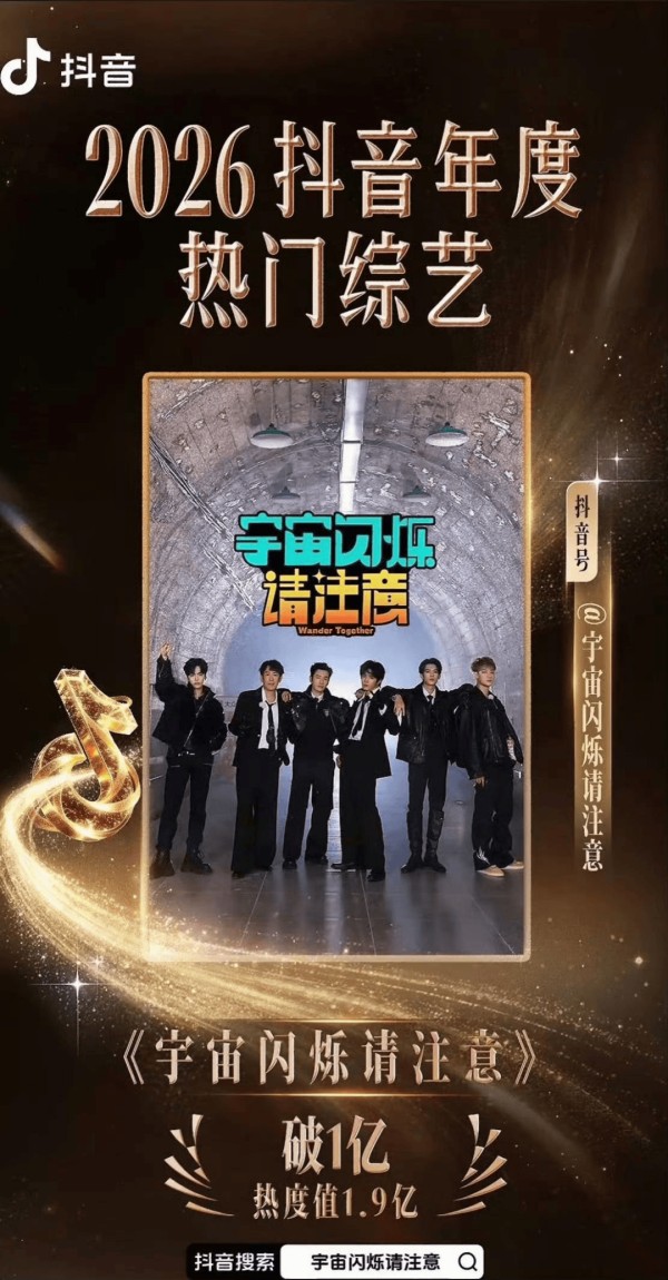 其中《宇宙闪烁请注意》更是凭借超强情绪价值实现口碑热度双丰收,不仅蝉联云合1-2月综艺霸屏榜TOP1,全网最高市占率达33.4%,新综赛道市占率两度突破70%,还以破2亿热度值的成绩被认证为2026年首部抖音年度爆款综艺。