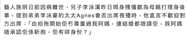 李泳汉与李泳豪兄弟俩这些年的关系一直是老死不相往来的状态,本来外界还以为借着施明的离世,兄弟俩有可能冰释前嫌,一起打点施明的丧礼,不过就目前来看,这个可能性几乎为零。李泳汉放出了强硬的态度,明确表示会邀请弟弟参加,却又拒绝弟媳参加,这岂不是又触动了李泳豪的神经?兄弟俩的不和最初在2022年李泳豪与Agnes结婚的时候,当时施明与李泳汉的确都没有出席,对此家人都保持沉默,不予以回应。而真正爆发是在同年底施明突然摔倒昏迷入院后,李泳豪不满李泳汉将施明入院一事对外宣扬,最终导致兄弟决裂。