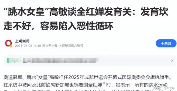 第二次提醒是在 2025 年 8 月,彼时全红婵的身形已经开始变化,网上 "发胖"" 状态下滑 "的议论开始出现,高敏在央视的采访中再次结合自身经历,语重心长地说:" 所有女跳水运动员都会面临生长发育的过程,这是一个坎儿,就像走钢丝一样,走不好就会掉下去,容易形成恶性循环。