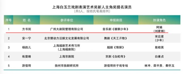 4月8日,第34届上海白玉兰戏剧表演艺术奖(以下简称“上海白玉兰戏剧奖”)各奖项提名名单揭晓,广州粤剧院青年粤剧表演艺术家李嘉宜凭借粤剧《双绣缘》卢眉娘一角入围主角奖提名。广州大剧院管理有限公司方书剑凭借音乐剧《雄狮少年》阿娟(刘家娟)一角入围新人主角奖提名。