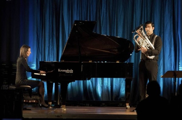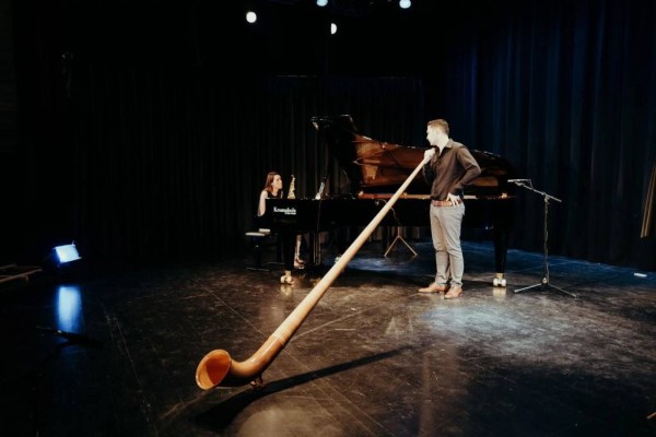 她能在一场演出里切换钢琴、小提琴、长笛、萨克斯。他的乐器更冷门,不仅有国内少见的上低音号,还有长达三四米的阿尔卑斯号。他们就是来自瑞士的悦生二重奏(GIOVIVO)。
