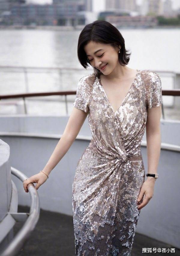 如果说短发是点睛之笔,那这条香槟色亮片连衣裙,就是她这次造型的吸睛所在,很多人对亮片连衣裙的印象,还停留在俗气、显胖的阶段,但梅婷这条,却把亮片穿出了贵气又温柔的质感。连衣裙采用了香槟银渐变的亮片面料,在光线下泛着细碎的光泽,不刺眼、不浮夸,像把流动的月光穿在了身上。