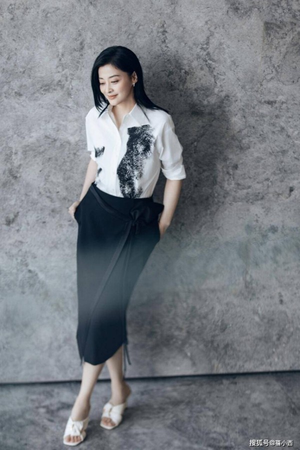 梅婷的这一套黑白穿搭,简直是职场穿搭的天花板。一件带着水墨印花的白衬衫,搭配一条利落的黑色半身裙,再踩上一双简约的白色方头穆勒鞋,整套 look 没有多余的装饰,干练还高级。