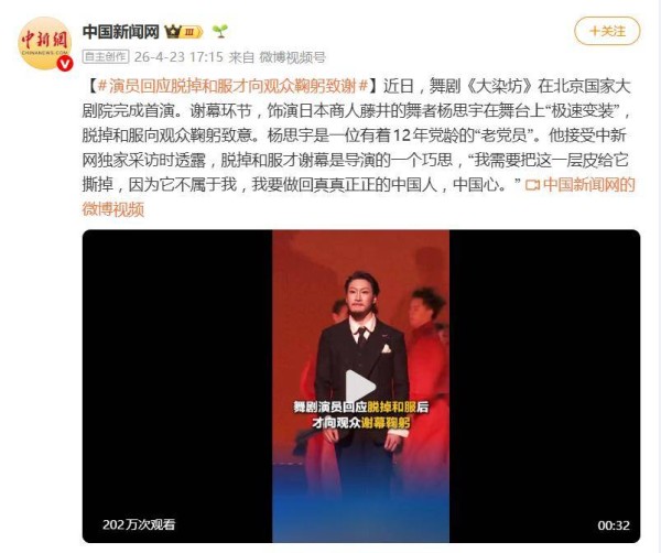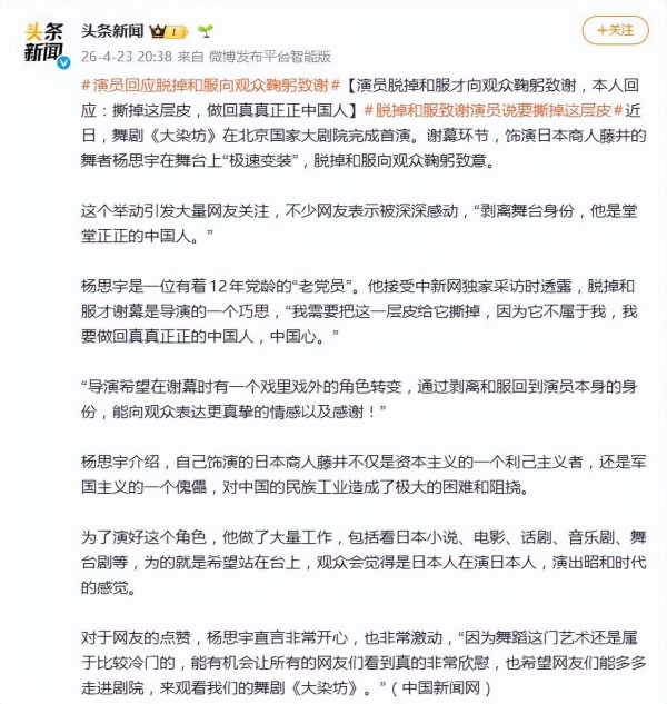 演员脱掉和服才向观众鞠躬致谢,网友:“他是堂堂正正的中国人”,本人回应破防!国家大剧院《大染坊》首演,舞者杨思宇脱掉和服才谢幕鞠躬